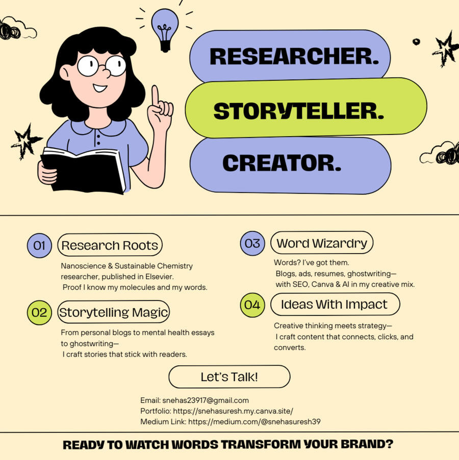 I’m Sneha—a published researcher and content writer who makes science, psychology, and even the messiest mental health topics easy to understand and impossible to ignore. Whatever the niche, I’m your go-to for crisp, clear, and clever content that connects.